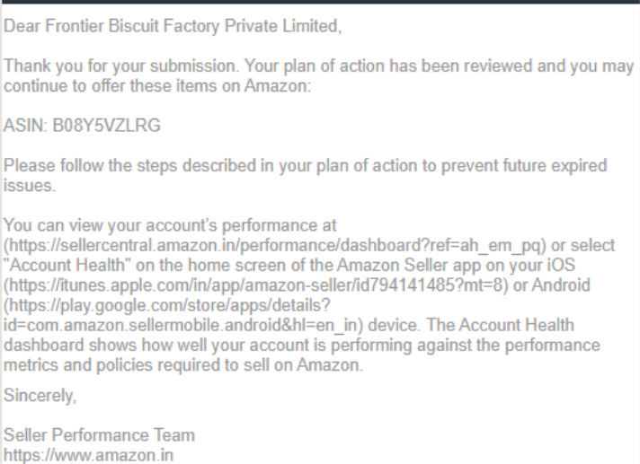 In June 2021, we received performance notification from Amazon that two of the most selling ASINs are blocked by Amazon due to customer complaints. We followed up with Amazon with Plan of Actions to reactivate the listings, and same was approved.